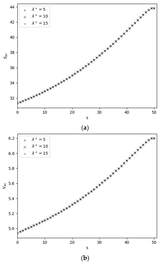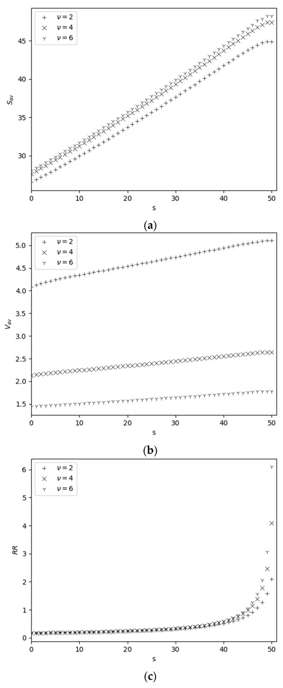 The dependence of performance measures on and ν is shown in Figure 4, where . The measure increases both in and ν, see Figure 4a. Indeed, an increase in and ν leads to an increase in the rate of filling the warehouse to its maximum size. Measure is increasing versus , while it is a decreasing function versus ν. Here is decreasing versus ν, since is an increasing function with respect to ν; see Figure 4b; the increase in with respect to is explained as above, i.e., as s increases, the probability that the inventory levels fall to zero due to catastrophes also increases, so the average order size is also an increasing function versus . Measure is an increasing one with respect to both and ν, since an increase in both and ν leads to an increase in the probability that the inventory level is positive; hence, the rate of replenishment of inventory due to catastrophes also increases; see Figure 4c. From Figure 4d, we conclude that the is almost constant (does not decrease) depending on and ν; only for small values of , i.e., s < 10, we observe insignificant differences between the values of for different values of ν. Measure is a decreasing function versus both and ν, see Figure 4e. This behavior of this measure is expected, since an increase in both and ν leads to an increase in the average inventory level and, as a result, to a decrease in .