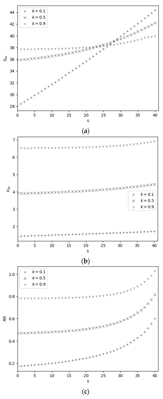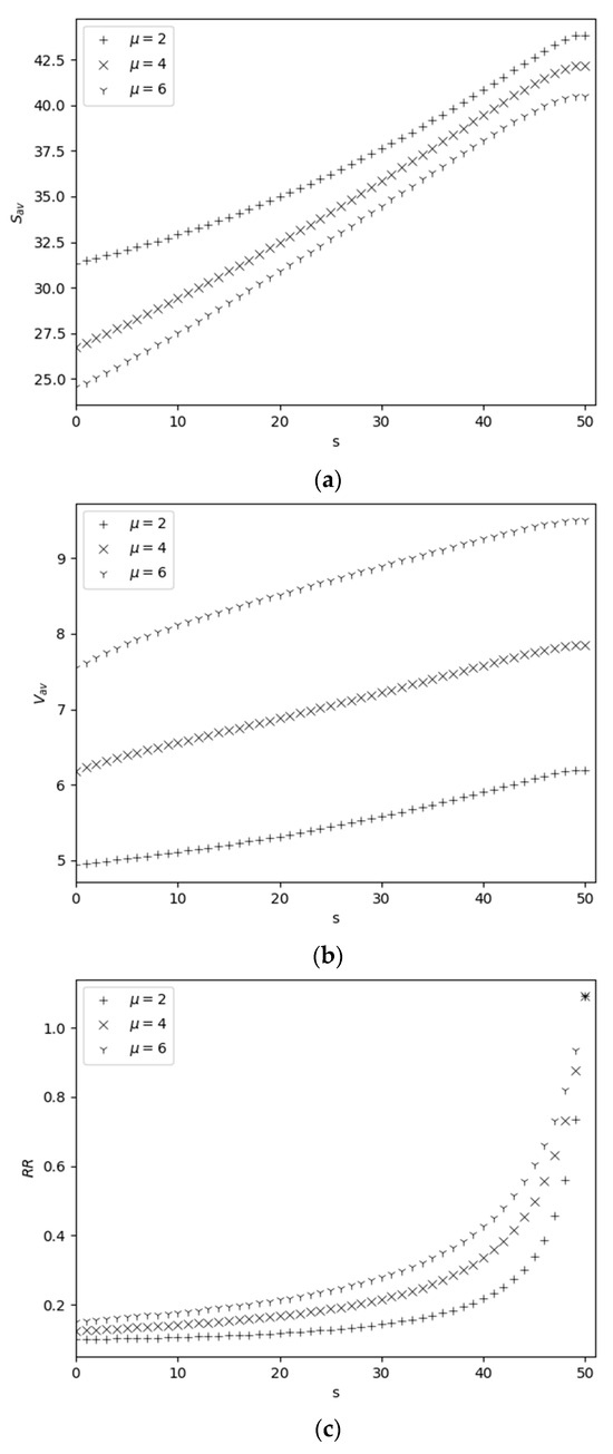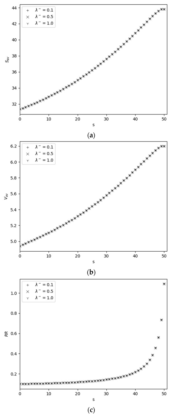 Performance measures are computed and numerically evaluated for different sets of values for the loading parameters and the reorder point. In all experiments, the values of the following parameters are fixed: So, Figure 1 shows the dependence of performance indicators on reorder point for the three different values of , where From these plots, we conclude that inventory-related performance measures are almost independent of the rate of c-customers but significantly dependent on the reorder point, see Figure 1a–c. Note that all inventory-related performance measures are increasing functions versus reorder points. Measure is an increasing function versus , and this fact was expected; see Figure 1a. At first glance, the increase in versus seems unexpected; see Figure 1b. However, this fact has the following explanation: as increases, the reorder rate increases (see Figure 1c), and as a result, the average order size increases. The is an increasing function with respect to because as increases, the probability that the inventory level is positive also increases and, hence, becomes an increasing function; see Formula (10) as well. For the selected data, the rate of its increase becomes very high at large (possible) values of the reorder point, see Figure 1c. In contrast, the queuing-related performance measures are almost independent of the reorder point, see Figure 1d,e. For selected initial data, the mean number of consumer customers in systems for all values of are very close to the buffer size (); see Figure 1d. Therefore, the loss rate is very close to ; see Figure 1e.