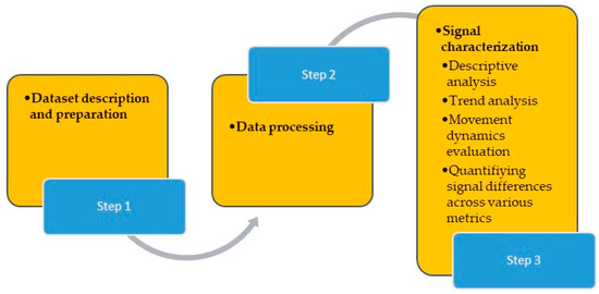 The statistical method proposed in this document is formed by three steps which are mentioned below: Step 1. Dataset description and preparation; Step 2. Data processing; and Step 3. Signal characterization.