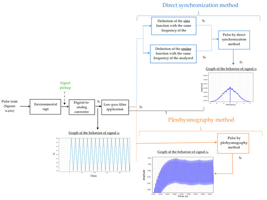 In this study, an AC designed for pulse measurement was used. Its operation includes the microprocessor (PIC16F1615), through the pulse width modulation (PWM) function, generates a pulses train with a frequency of 122 Hz that forms a square wave composed of 8 pulses of red light and 8 pulses of infrared light spaced by 5.12 × 10−4 s; its capacity allows the storage of 127,984 units of data. The same microprocessor controls an infrared led on/off system (VSMD6694). This control allowed one led to remain on for a period of 8 pulses, while another remained on and vice versa. The emission of the beams hits the surface of the environmental signal through the optical fiber. Once it interacts with the environmental signal, the reflected light is collected by another optical fiber and processed by a sensor (TEMD7000) connected to a trans-impedance circuit (ADA4505-2AEMZ) and amplified to convert it into a digital signal (s1). s1 is the signal from the interaction of the beam with the skin: it is square and noisy. The processor sent the data to memory (CY15V104QN). The LED control process, data collection, and storage were carried out for 65.52 s (1.09 min). The signal sampling frequency was 1950 Hz. Once stored, the data were retrieved and emptied into a computer and processed. At this point, a low-pass filter was applied (s2) (the filter has a dual purpose: to eliminate noise and transform the square signal into a sine wave to apply the synchronous detection technique) to later define the sine function with the same frequency of the analyzed signal (s3), as well as the cosine function (s4), and to also later calculate the pulse by direct synchronization (s5). With the objective of a comparison between the signals of the pulse by the methods of direct synchronization and plethysmography, (s6) was calculated too. See Figure 2, where the fluxes of the signal were calculated by both methods. Within this work, the signals of the time series generated by AC for an environmental signal were analyzed, this signal was taken under normal conditions of pressure and temperature.
