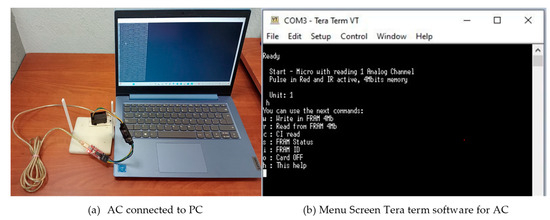 Interaction AC-PC and menu screen tera term software. (a) AC connected to PC; (b) Menu Screen Tera term software for AC.