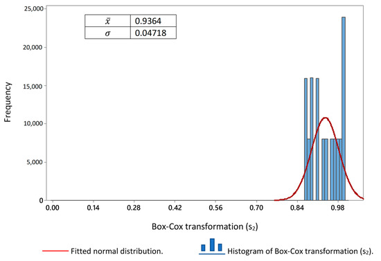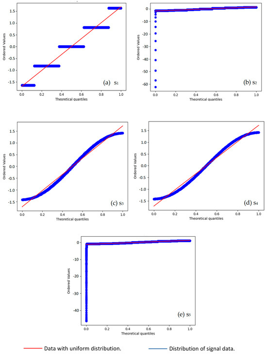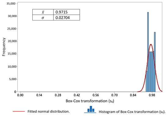 The behavior of the descriptive statistics used in this research for all signals was measured in volts. Firstly, the results obtained for the signals by the direct synchronization method are shown. The graphical methods used to detect the type of distribution in the signals showed the presence of more than one. Figure 4, Figure 5 and Figure 6 have been focused on showing the distribution of the data of the signals processed to obtain the pulse by the direct synchronization method. In Figure 4, the normal distribution Q-Q plot shows that, although the signals had a normal distribution to the center, this behavior was different in the right and left tails in all cases. In Figure 5, the Q-Q plots of uniform distribution show the signals again . Figure 6 show the histogram of the signals . The graphical form of the histograms of signals s2, s5 and s6, could confuse the reader. Therefore, to correct this, the minimum value with the opposite sign of each series was added to each value and the Box–Cox transformation was subsequently obtained (see Table 3). Figure 7, Figure 8 and Figure 9 show the Box–Cox transformation histogram for s2, s5 and, s6, respectively.