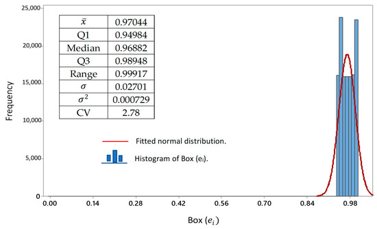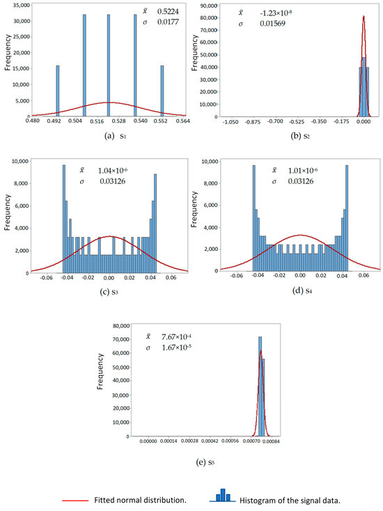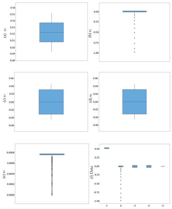 Once the existence of more than one distribution in the data was known, the signal data were analyzed with Promodel’s stat fit tool from 30 samples of 50 data. The identified distribution is shown in Table 4. Distributions were presented in all signals except in s1, where the exponential distribution was not presented. Figure 10 shows the box and whisker plot for the signals, respectively starting from with , which, when normalized, takes average values tending to zero to finish taking values for the pulse distribution, with . In Figure 10, it can be seen that the distribution of the data is centered for all cases and tends towards zero for the signals . In the cases of signals and , extreme points are shown in the lower whisker (represented graphically as a sequence of asterisks).