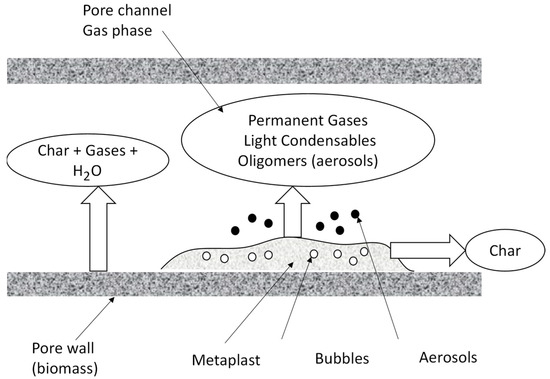 - Dufour, A.; Ouartassi, B.; Bounaceur, R.; Zoulalian, A. Modelling intra-particle phenomena of biomass pyrolysis. Chem. Eng. Res. Des. 2011, 89, 2136–2146. [Google Scholar] [CrossRef]