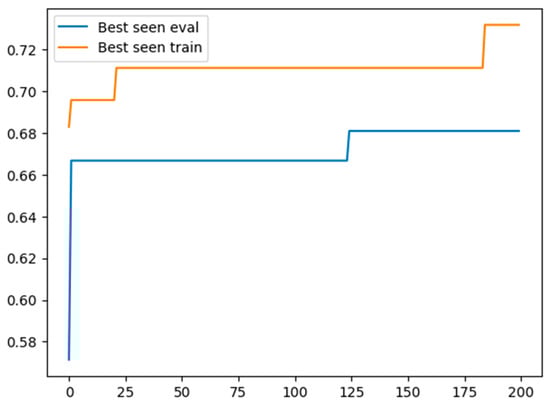 As an example, we report in Figure 3 on the evolution of the “best seen” (i.e., the observed best performance value) for both the “training” and the “evaluation” sets, over the sequence of generated prompts. An improvement of the best performance over the “training” does not necessarily imply an improvement on the “evaluation”. Thus, as suggested in [9], the prompt associated to the best performance on “evaluation” was selected to be tested over another completely different dataset (i.e., the test set). The associated results are reported in Table 1.