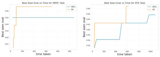 Finally, we also report on a comparison between our approach and BDPL [9] in terms of best performance on “evaluation” with respect to runtime (i.e., “time taken”). Results are in Figure 3 for the benchmarks MRPC and RTE.