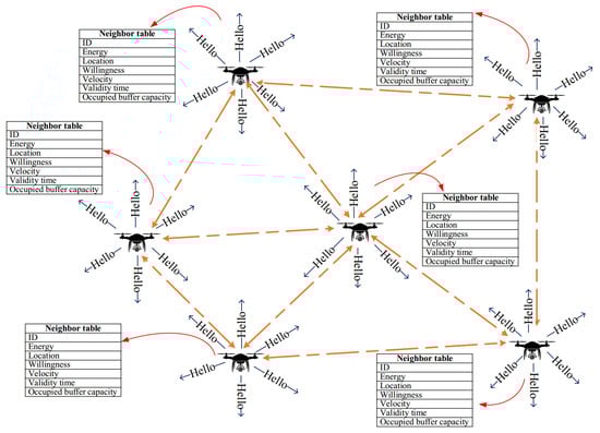 In this phase, UAVs propagate hello messages to their surrounding nodes, and at the same time, they store the information obtained from the hello messages of their surrounding nodes in a neighbor table. See Figure 2.