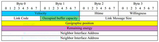 - Compared with OLSR, the hello message in OLSR+GPSR includes four additional fields, i.e., geographic location (yellow field), remaining energy (pink field), occupied buffer capacity (green field), and velocity (blue field). See the format of this message in Figure 3.