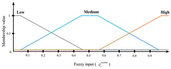 Figure 4. Fuzzy membership diagram of . - Position prediction error (): The propagation interval of hello messages and have an opposite relationship with each other, so if estimates its future position with a large error, it should shorten its hello propagation interval to reduce the position prediction error. Note that has access to its real position through the positioning device. Additionally, it uses the movement equation to estimate its new position. In OLSR+GPSR, each assumes that its velocity vector is fixed in the time period between two consecutive hello messages. As a result, can calculate its future position in the next hello message based on its previous position and its current velocity vector .where is the estimated spatial coordinates of when receiving the next hello message, and expresses the hello propagation interval.Now, the error value () between the actual position, i.e., , and the estimated position, i.e., , is obtained from Equation (6).Finally, is normalized according to Equation (7) to limit this value to .where is the maximum error of the estimated position in the network, and represents the normalized value of . Now, must convert into a fuzzy parameter according to the membership diagram presented in Figure 5. According to Figure 5, this fuzzy parameter involves three states, i.e., low, medium, and high.