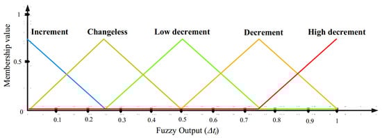 The output of this fuzzy system is the change rate () of the hello propagation interval for each . After determining this change rate, the hello propagation interval () will be equal to . If the change rate experiences negative growth, will be shorter, and hello messages will be sent faster. In contrast, if this change rate grows positively, will be longer, and hello messages will be sent to neighbors at longer intervals. is converted to a crisp value using a defuzzification process called averaging. The membership diagram of this fuzzy parameter is presented in Figure 6. According to this figure, the change rate of the hello propagation interval includes five states, i.e., increment, changeless, low decrement, decrement, and high decrement.