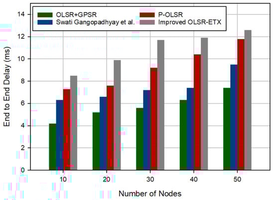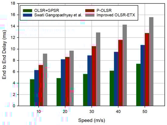 Figure 8 compares the end-to-end delay in different schemes so that the number of UAVs is between 10 and 50, and their speed is set to 20 m/s. As shown in this figure, OLSR+GPSR has reduced EED by 22.43%, 38.01%, and 47.44% compared to Gangopadhyay et al., P-OLSR, and enhanced OLSR-ETX. Its main reason is that OLSR+GPSR has removed two steps, namely broadcasting TC messages and calculating transmission routes between all UAVs, and instead, it uses a greedy forwarding technique, whereas Gangopadhyay et al., P-OLSR, and improved OLSR-ETX use the TC message broadcast process to find all possible routes between UAVs but it is very time-consuming. Another reason for this issue is that OLSR+GPSR determines MPRs based on several parameters, including the neighbor degree, node stability (which is obtained from the position and movement information of UAVs), occupied buffer capacity, and remaining energy. This issue leads to the selection of stable MPRs, which reduces the need to update these nodes and, consequently, lowers the delay in FANET. Another point inferred from Figure 8 is that EED and the density of UAVs have a direct relationship with each other, and if the density of nodes is high, EED in the routing process will increase in all schemes. Its reason can be the increase in traffic and congestion in the network. It causes a number of lost data packets, which must be retransmitted. In addition, Figure 9 shows EED in different methods, so that the number of nodes is set to 30, and their velocity is between 10 and 50 m/s. According to this figure, OLSR+GPSR has reduced this evaluation metric by 33.94%, 43.19%, and 53.32% in comparison with Gangopadhyay et al., P-OLSR, and enhanced OLSR-ETX. We have stated the reasons above. Moreover, in Figure 9, it can be seen that EED in the routing process is increasing when the velocity of UAVs is rising because increasing the velocity of UAVs will lead to faster topology changes in the network. As a result, MPRs must be updated in a shorter period of time. This issue will increase EED in the routing process.