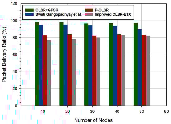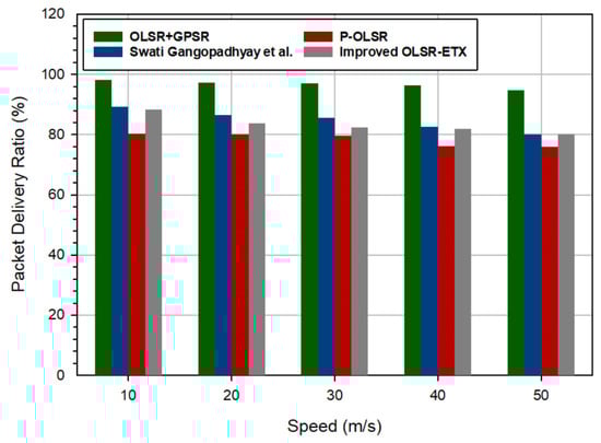 Figure 10 shows PDR in different schemes. It is assumed that the number of UAVs is between 10 and 50, and their velocity is a fixed value (20 m/s). According to this figure, OLSR+GPSR has increased this evaluation metric by 4.13%, 16.86%, and 21.51% in comparison with Gangopadhyay et al., P-OLSR, and improved OLSR-ETX, respectively. This is because the proposed method pays attention to node stability along with neighbor degree when choosing MPRs. The stability scale is calculated based on the position and mobility (i.e., velocity and movement angle) information of UAVs. As a result, MPRs in OLSR+GPSR are more stable than other methods. This reduces the number of lost packets and, consequently, increases PDR. On the other hand, in the proposed method, the buffer information of UAVs is considered in the MPR selection process to prevent congestion in UAVs. This also has a positive effect on increasing PDR. As shown in Figure 10, PDR in OLSR+GPSR does not change based on the number of UAVs, while PDR in other methods is decreasing when the number of UAVs is increasing. This issue is rooted in the fact that the increase in the number of UAVs causes an increase in congestion in FANET. As a result, some packets are lost due to collisions or high traffic in the network, but OLSR+GPSR takes into account the buffer capacity of the flying nodes in the MPR selection process and prevents congestion in the network, and consequently, PDR in our scheme experiences an almost constant rate. Furthermore, Figure 11 makes a comparison between different methods in terms of PDR when the number of UAVs is equal to 30, and their velocity is between 10 and 50 m/s. Based on this figure, OLSR+GPSR has increased PDR by 14%, 23.27%, and 16.11% in comparison with Gangopadhyay et al., P-OLSR, and improved OLSR-ETX. The reasons related to this issue were stated above. On the other hand, different methods experience a lower PDR when increasing the velocity of UAVs. This is caused by higher changes in the network topology. The better performance of the proposed method in comparison with other methods is due to considering the mobility information of UAVs in the routing process. OLSR+GPSR adjusts the propagation period of hello messages according to the velocity of UAVs. This mechanism makes more adaptability between OLSR+GPSR and the dynamic environment of FANET.