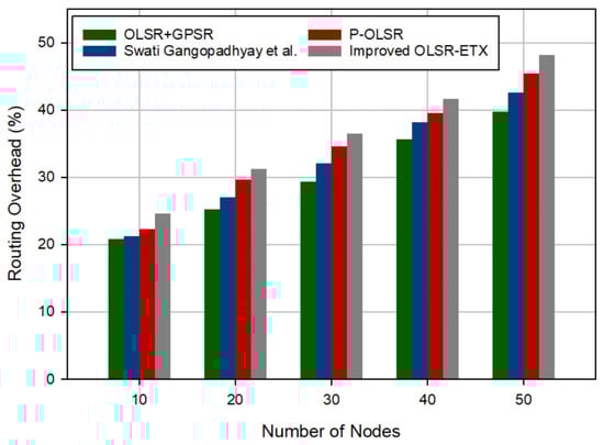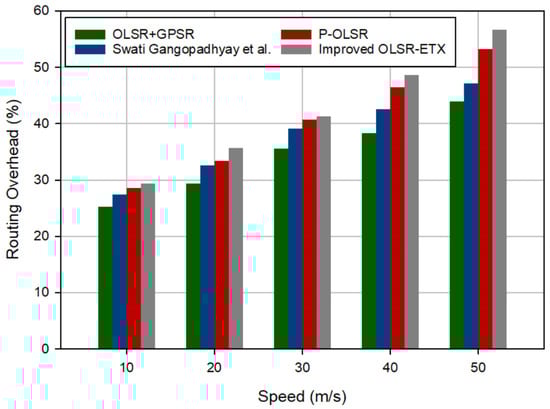 Figure 12 shows the routing overhead in different methods when the number of UAVs is changed between 10 and 50, and their speed is set to 20 m/s. According to this figure, OLSR+GPSR has reduced the routing overhead by approximately 6.33%, 11.95%, and 17.12% in comparison with Gangopadhyay et al., P-OLSR, and improved OLSR-ETX, respectively. The good performance of the proposed method in comparison with other methods has two reasons. First, OLSR+GPSR uses a fuzzy system to dynamically adjust the hello message propagation interval based on velocity and position prediction error so that high-speed UAVs have a shorter hello propagation period and low-speed UAVs experience a longer hello propagation period. As a result, the proposed method is more compatible with the dynamic environment of FANET than other routing methods. In addition, OLSR+GPSR eliminates the two phases, namely broadcasting TC messages and calculating transmission routes, and applies greedy and perimeter forwarding techniques. Hence, OLSR+GPSR reduces routing overhead significantly. In addition, according to Figure 12, it can be seen that there is a direct relationship between the routing overhead and the number of UAVs. Therefore, when the number of UAVs is increasing, the routing overhead is also increasing. This is because when the number of UAVs is high, more control messages will be exchanged between them in the network, meaning that, the routing overhead is high. Figure 13 shows a comparison between routing overhead in different methods. In this experiment, it is assumed that the number of UAVs is 30, and their velocity is between 10 and 50 m/s. This figure shows that OLSR+GPSR has reduced the routing overhead by 8.68%, 14.77%, and 18.52% in comparison with Gangopadhyay et al., P-OLSR, and improved OLSR-ETX, respectively. We have mentioned the reasons above. Additionally, this figure confirms the existence of a direct relationship between the routing overhead and the velocity of UAVs because the higher velocity of UAVs will increase the instability of UAVs, which causes higher topology changes in the network. This issue increases the number of control packets due to the need for faster updating MPRs.