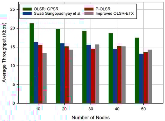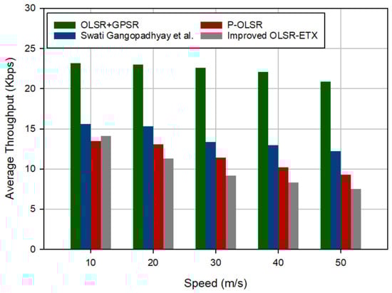 Figure 14 shows a comparison between the throughput of different methods when the number of UAVs is between 10 and 50, and their velocity is set to 20 m/s. According to this figure, OLSR+GPSR increases throughput by 27.78%, 30.01%, and 32.33% in comparison with Gangopadhyay et al., P-OLSR, and improved OLSR-ETX, respectively. As stated in Section 6.1 and Section 6.2, the proposed method has improved delay and PDR because it designs the fuzzy system to dynamically adjust the hello broadcast interval according to the velocity of UAVs, selects stable MPRs, and removes the TC message propagation process. This issue has increased throughput in OLSR+GPSR. According to Figure 14, throughput and the density of UAVs are oppositely related to each other. When the number of UAVs is high, OLSR+GPSR increases network traffic. Hence, more data packets are lost in the network, and on the other hand, more time is needed to send other packets to the destination. These events reduce throughput in all methods. Figure 15 shows a comparison between throughput in different methods when the number of UAVs is equal to 30, and their velocity changes from 10 to 50. According to this figure, OLSR+GPSR has increased throughput by 60.86%, 94.43%, and about two times compared to Gangopadhyay et al., P-OLSR, and enhanced OLSR-ETX, respectively. The reasons for this were stated above. This figure shows an inverse relationship between the velocity of UAVs and throughput. In all methods, when the velocity of UAVs is increasing, the topology changes in the network is more. Eventually, the number of lost packets is greatly increased. It will result in a lower throughput.