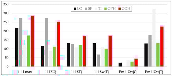As a summary of results, the total number of instances where each formulation obtained the optimal or the best feasible solution in each problem is shown in Figure 1. In other words, Figure 1 depicts the summation of the C column from Table 5, Table 6, Table 7, Table 8, Table 9, Table 10 and Table 11. It can be seen that ODH outperforms the other formulations in most of the problems. Regarding the Pm||ΣwjTj problem, the TI formulation achieves a great performance only in scenarios with a small number of jobs.