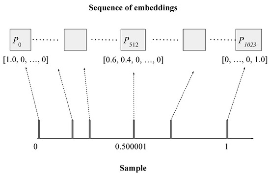 Converting a sample into a sequence of L embeddings (), each of size K (). The sample contains 6 observations, ranging from 0 to 1 (after normalization). The left-most observation is mapped to the first dimension of the first embedding. The rightmost observation is mapped to the last dimension of the last embedding. The observation 0.500001 maps to somewhere between the first and second dimensions of the 512th embedding, and thus its weight is distributed between these two dimensions.