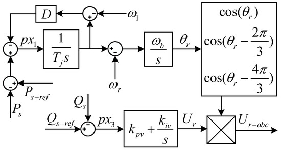 Because the grid-side converter along with its controller and DC bus capacitor are replaced by a voltage source, only the rotor-side converter with VSG control is considered for the DFIG system. At this time, the line current and the stator output current of the DFIG are equal, i.e., , .