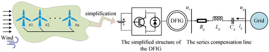 The simplified structural block diagram of the DFIG connected to the grid by the series compensation line is shown in Figure 3; the voltage–current relationship of line resistance, inductance, and capacitance can be expressed as follows: