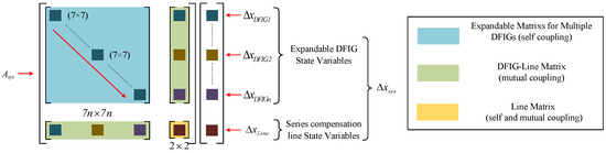 where the state variables are denoted as , is the characterization matrix of the system, and the series compensation stability of the DFIG system can be determined by solving the eigenvalues of this characterization matrix. The structure of and is shown in Figure 4.