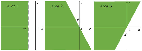 The Guardian map method for identifying parameter selection areas is restricted to systems with stable matrices, where all the eigenvalues possess negative real parts. Adapting this method for irregular regions such as the parameter selection area requires mapping the negative half-plane onto the target region. This process entails subdividing the area and identifying their intersections with the mapping, as illustrated in Figure 6. If the eigenvalue set of the target system matrix falls within Area 1, it corresponds to Criterion I. Alternatively, if it falls within Area 2 or Area 3, it aligns with Criterion II.