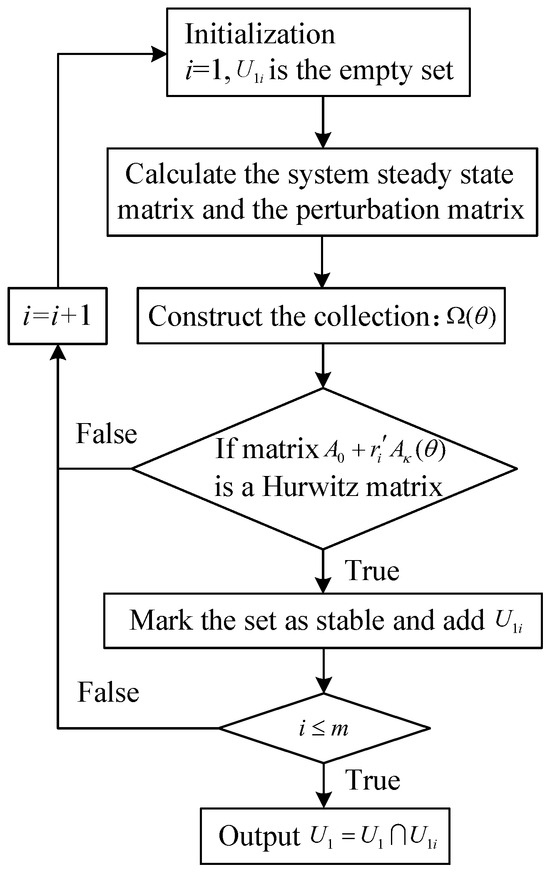 Illustrated in Figure 7 is the execution flow of the parameter selection area. First, the setup initializes the initial conditions. Subsequently, it iterates through calculating the system’s steady-state matrix and perturbation matrix, simplifying the system matrix, computing the eigenvalues, constructing the ensemble, and checking the system stability. System stability is assessed based on the fulfillment of the Hurwitz matrix conditions, and stable parameter intervals are appended to the set. This loop continues until all parameter combinations are checked, resulting in the stable parameter set. Moreover, Algorithm 1 allows the parameter selection areas and to be derived using matrices and . Consequently, the parameter selection area is expressed as the intersection of , , and , denoted as .