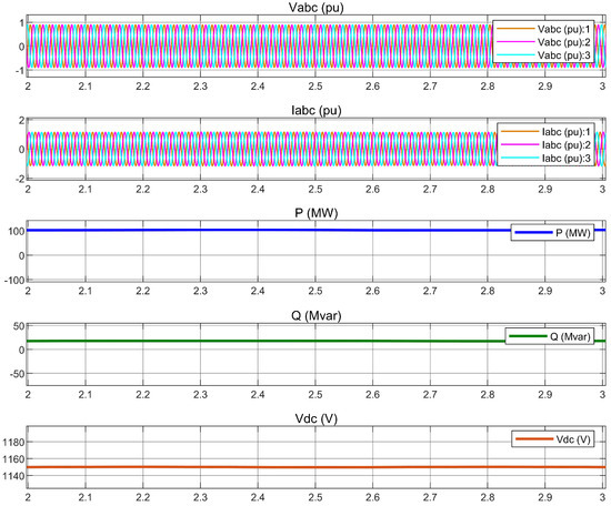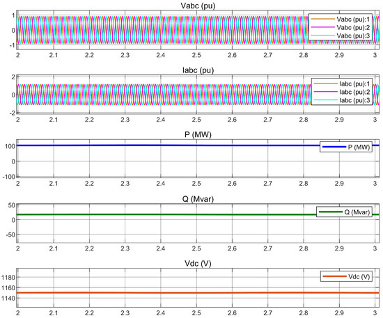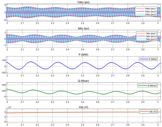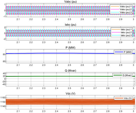 First, the study was carried out in an ideal situation where the wind farm parameter settings and operating conditions are exactly the same. A detailed electromagnetic transient time domain simulation model was built in MATLAB/SIMULINK to verify the results of the model analysis. As the parameters of each DFIG are the same, the small differences in the DFIG inlet currents and voltages are ignored. The output voltage, output current, active power, reactive power voltage, and DC port voltage waveforms of the DFIG in the initial state are shown in Figure 8, respectively. According to the simulation results, the system under the series compensation capacitance value = 3.5 pu and the integral coefficient = 10 is shown to be stable. As shown in Figure 9, the parameter selection area is calculated from Algorithm 1, provided in Section 4. Because the parameter coordinates at this point are located within the selection area, the system is judged to be stable according to the methodology of this paper. This result is the same as the simulation results. Furthermore, the operating points of the system located in the parameter stabilization region are drawn in the figure using the point-by-point test method (indicated by the blue “*”). The accuracy of the strategy proposed in this paper is confirmed by the fact that almost all of the test points are located within the range of the parameter selection area.