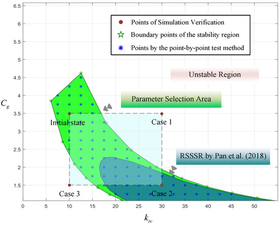 When , , and have been acquired, the method for calculating the parameter selection region using Guardian mapping can be utilized to identify the respective regions. The region targeted in this study is the overlapping part of the three regions fulfilling the aforementioned two stability criteria.