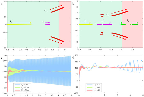 Figure 5 illustrates the boundaries of the parameter selection area, which are established according to two criteria. Criterion I delineates the limits for the real parts of the system’s eigenvalues, ensuring stability and rapid oscillatory decay, while Criterion II establishes the threshold for the damping ratio at each stable operating point.
