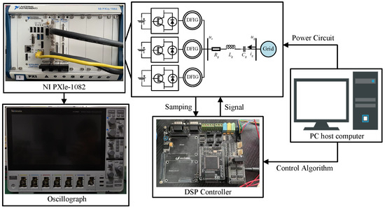 The effectiveness of the proposed method for computing the DFIG parameter selection area was further validated experimentally. Hardware-in-the-loop (HIL) experiments were conducted utilizing a setup comprising a PC host computer, DSP controller, NI PXIe-1082, and oscillograph. The core of the hardware control system is the NI real-time simulator, which handles sensor signal processing and control command execution. Specifically, the NI PXIe-1082 operates the power system. Meanwhile, the DSP controller executes the control algorithm for the power system. The PC host computer is responsible for developing simulation control strategies and constructing the main circuit for the power system. It establishes connections with the DSP controller and the NI real-time simulator, as illustrated in Figure 14, facilitating the transfer of control algorithms to the DSP and power circuit configurations to the NI simulator.