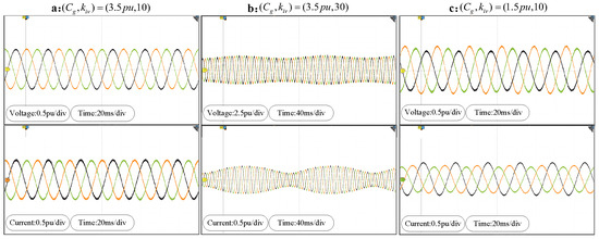Initially, the series compensation level and control parameter were the same as in Section 5. The area of and is illustrated in Figure 9, where the green domain indicates system stability. For the selected parameters ((,) = (3.5 pu, 10)), the DFIGs system is stable, as demonstrated by the stable AC voltage and current in Figure 15a; however, when the parameters are changed to ((,) = (3.5 pu, 30)) and ((,) = (1.5 pu, 10)), the DFIGs system becomes unstable, as shown in Figure 15b,c. These experimental results confirm that the system remains stable when the series compensation level and control parameter fall within the parameter selection area, and that it can become unstable when the parameters lie outside this area. Moreover, in the conservativeness verification, ((,) = (3.5 pu, 10)), ((,) = (3.5 pu, 30)) and ((,) = (1.5 pu, 10)) are not within the RSSSR of [35]. However, ((,) = (3.5 pu, 10)) is stabilized in the HIL experiment. Compared with other benchmark algorithms, this paper’s algorithm for calculating the parameter selection area has lower conservativeness. In the accuracy verification, only ((,) = (3.5 pu, 10)) is located within the area where neither ((,) = (3.5 pu, 30)) nor ((,) = (1.5pu,10)) are located in the point-by-point testing method. The stable operation of ((,) = (3.5 pu, 10)) in the experimental results confirms the accuracy of the algorithm. In conclusion, the conservatism and accuracy of the algorithm are well verified. The algorithm provides valuable guidance for selecting appropriate series compensation levels and control parameters in real-time applications.