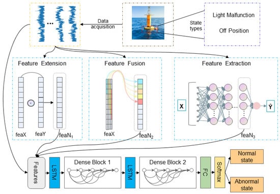 Wang et al. [] introduced an innovative CNN-LSTM architecture for equipment health monitoring, demonstrating the feasibility of state recognition in raw datasets without the necessity for extensive feature engineering. Building upon this foundation, our research extends these methodologies by enhancing feature learning to improve recognition accuracy, thereby addressing gaps not yet fully explored []. Zhao et al. [] utilized a BiLSTM network to analyze data from smartphone sensors, such as accelerometers and gyroscopes, circumventing the limitations of sole reliance on GPS data. However, given the complex environmental conditions of buoys, which preclude the acquisition of diverse sensor data, our study employs advanced feature processing techniques to enhance feature representation, thereby improving state recognition accuracy under conditions of limited feature availability. Mekruksavanich et al. [] demonstrated the capability of deep learning frameworks to process complex time series data and extract meaningful features, inspiring our application of deep learning, particularly LSTM techniques, to extract intricate features from limited sensor data for more precise state recognition. Our work not only inherits methodologies from these studies but also innovatively expands upon them to meet the unique requirements of buoy state recognition, aiming to facilitate more accurate state recognition under conditions of feature sparsity through feature extension. However, when confronted with specific sparse datasets, relying solely on raw data may not accurately identify the working state of a device.
