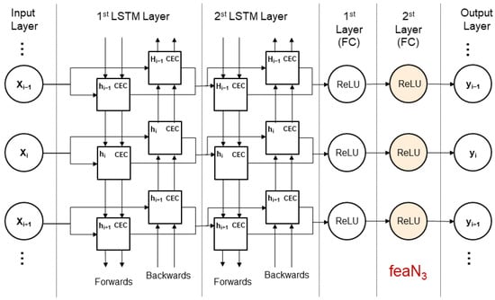 The input layer is responsible for receiving input sequences in which each X represents a different time step of the input feature vector. The first LSTM layer processes the input sequence in the forward direction, with each unit containing a Constant Error Carousel (CEC) for storing and forgetting information as the memory component and a hidden state h representing the network’s short-term memory. The second LSTM layer, similar to the first, processes the sequence in the reverse direction, enabling the network to utilize information from future time steps during training []. The subsequent two fully connected layers (FCs) are dense layers, with each neuron connected to all neurons in the preceding layer, facilitating the nonlinear transformation of learned features. The ReLU activation function applied after each FC layer introduces nonlinearity, assisting the network in learning complex data patterns. The output layer provides the final outputs , corresponding to the predictions of the input sequence after being processed by the network.