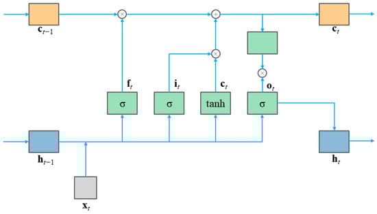 The long short-term memory (LSTM) neural network, a specialized variant of recurrent neural networks, demonstrates outstanding performance in sequence modeling and processing, rendering it a crucial algorithm in the realm of deep learning. In recent years, significant progress has been made in LSTM research, particularly in the domain of state recognition [,,,]. Conventional recurrent neural networks are plagued by issues such as gradient vanishing and exploding, rendering them unsuitable for effective long-sequence modeling. In contrast, LSTM networks incorporate temporal memory units, enabling the adept assimilation of dependencies across varying temporal scales within time series data. Consequently, LSTM exhibits notable efficacy in handling and forecasting events characterized by intervals and delays in time series data. Within the LSTM hidden layer, the computational process of an individual neuron encompasses updating cell states and calculating output values. Internally, each neuron is equipped with three gating functions: the forget gate, input gate, and output gate. These gating functions judiciously regulate input values, memory states, and output values. The structural configuration of a neuron is delineated in Figure 5, with the mathematical formulations for the forget gate, input gate, and output gate denoted, respectively.