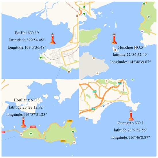 Ensuring diversity in datasets is crucial when evaluating the performance of the navigation aid state recognition model. The data employed in this study originate from the historical records of four navigation buoys managed by the Guangzhou Maritime Bureau. It’s pertinent to note that within the context of this study, the term “navigation aids” refers explicitly to buoys. These datasets encompass various features of the buoys, including longitude, latitude, voltage, current, and offset distance. Specifically, Figure 6 illustrates the geographical coordinates of the four buoys, namely, Beihai Port Buoy No. 19 (Beihai No. 19), Huizhou Port Buoy No. 5 (Huizhou No. 5), Houjiang Waterway Buoy No. 3 (Houjiang No. 3), and Guang’ao Port Area Buoy No. 1 (Guang’ao No. 1), with coordinates as follows: 109°5′36.48″ N, 21°29′54.45″ E; 114°38′39.87″ N, 22°36′52.49″ E; 116°57′31.23″ N, 23°28′12.92″ E; and 116°46′8.87″ N, 23°9′52.56″ E. A detailed description of each dataset is provided in Table 3. The diversity and richness of these datasets hold significant implications for assessing the performance of the navigation buoy state recognition model.