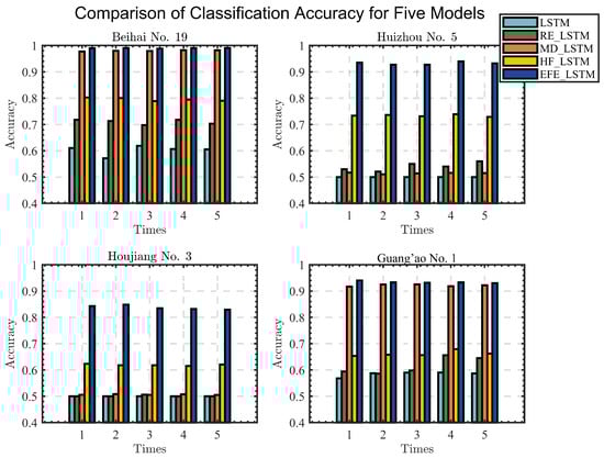 This section aims to validate the effectiveness of the algorithm proposed in this paper through comprehensive experiments. Firstly, we conducted an experimental analysis using four different datasets from the Guangzhou Maritime Bureau. We comprehensively compared and evaluated the navigation aid state recognition results of our proposed EFE-LSTM algorithm combined with a classic LSTM algorithm [] and an LSTM model with three modules. Subsequently, to verify the stability and reliability of the experimental results, we compared our EFE-LSTM algorithm with other algorithms such as BiLSTM, 1DCNN and LSTM_CNN. To mitigate the impact of random factors on the experimental results, we conducted five repetitions of the experiments and recorded the average results.