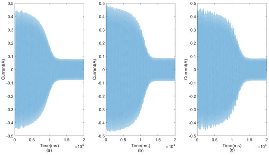 The startup transient of an induction motor encompasses the period immediately following its activation. Then, the motor accelerates from a standstill to the rated speed. The startup current changes in amplitude, with 50 Hz of typical supply frequency sinusoidal signal. Figure 1 shows three examples of signals exhibiting the typical startup currents, corresponding to a healthy machine, one with a broken bar, and one with two broken bars, respectively.
