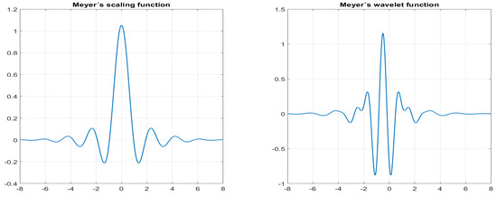 When we apply the Fourier transform to either the continuous wavelet mother or the scaling function , the smoothness provides a faster asymptotic decay in time. Actually, the wavelet mother has an infinite number of vanishing moments. In the time domain, the waveform of the Meyer scaling and wavelet functions have a shape as shown in Figure 3.