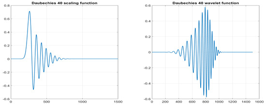 Daubechies wavelets [12] are a class of wavelets known for their orthogonality, compact support, and vanishing moments, making them optimal for signal processing tasks. Their compact support ensures efficient computation and localization of signal features, while the number of vanishing moments ensures the detail coefficient have close to zero values for regular signals. Additionally, Daubechies wavelets exhibit asymmetry with respect to the center of their support, enhancing their effectiveness in representing certain types of signals. We consider the Daubechies 40, which is a high order wavelet into the family and whose scaling and wavelet functions have a shape as shown in Figure 4.
