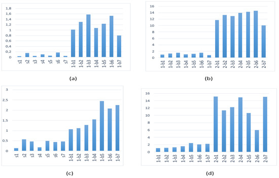 DWT9 indicator (a,b) for Meyer’s wavelet and (c,d) for Daubechies 40. (a,c) Healthy vs. one broken bar and (b,d) one broken bar vs. two broken bars.