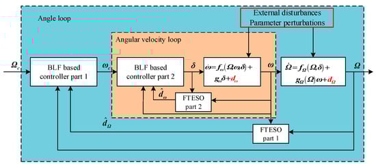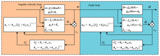 To introduce the proposed FTESO more intuitively, its structure is shown in Figure 3. The observer is divided into an angular-velocity loop and an angle loop, both of which have the same structure. The auxiliary observer utilizes state observation errors to estimate disturbance observation errors . Then, observation control inputs are obtained by combining observation errors , in the form of the AAPI, which can stabilize the error system in finite time.