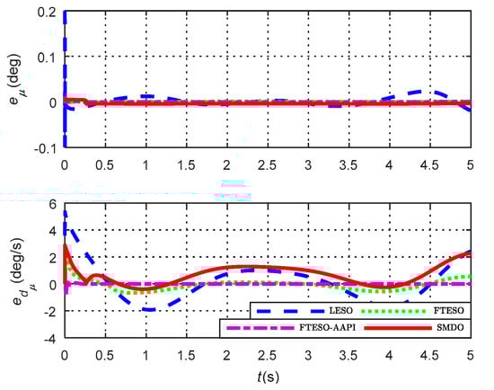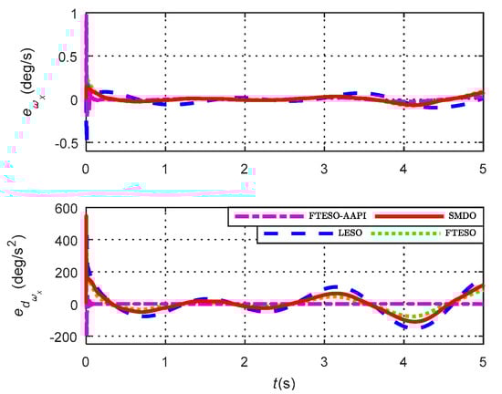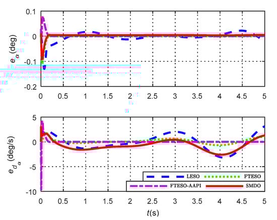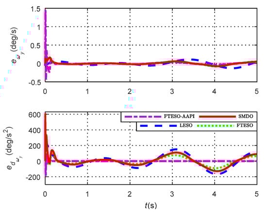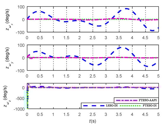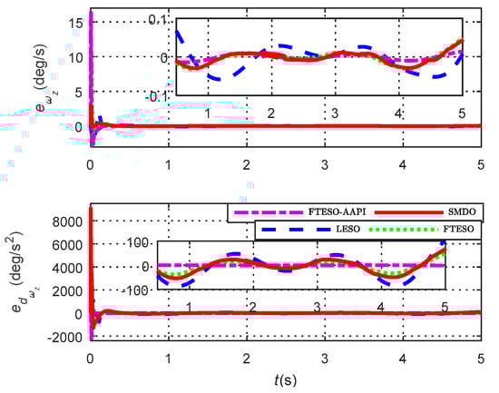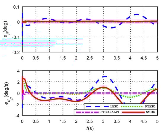 The comparison of estimation results is shown in Figure 4, Figure 5, Figure 6, Figure 7, Figure 8 and Figure 9. It can be found that both FTESOs estimate system disturbances with better accuracy than LESO. The proposed FTESO has a shorter convergence time and smaller observation error than other observers. Furthermore, the proposed FTESO has almost no fluctuations after convergence. This is because the observation controller of the FTESO designed according to the AAPI technique is more robust to the periodic signal added in disturbances.
