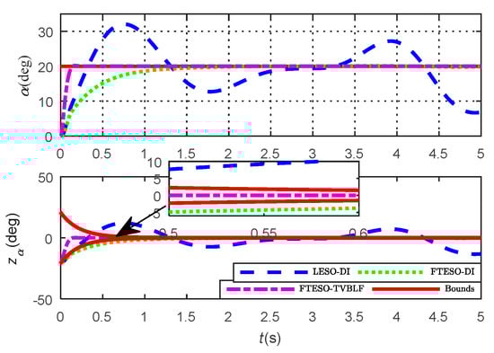 The angle control loop: (1) it can be seen from Figure 11, Figure 12 and Figure 13 that the LESO-DI does not accurately track the angular commands, which is caused by the estimation errors of the observers and is due to the tracking errors of the controller tracking the angular-velocity virtual commands being larger than the acceptable ranges. (2) The tracking errors of FTESO-DI: although they can converge eventually, the tracking accuracies during the convergence to steady states are outside the boundaries. (3) FTESO-TVBLF does not violate the output constraints during the total tracking commands and the steady-state tracking error is almost zero. We observe from the control law (56) of FTESO-TVBLF the nonlinear gain term , which guarantees constraints on the outputs. As the tracking errors approach the bounds, this term grows rapidly to offer the control ability to prevent from increasing.