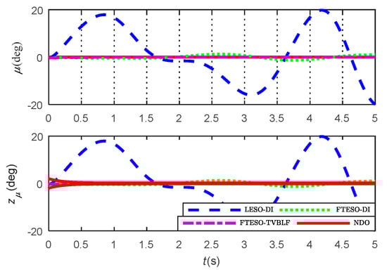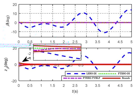 In this subsection, we develop three cases based on backstepping control: (1) with linear extended state observer and dynamic inversion-based controller (LESO-DI), (2) with finite-time extended state observer and dynamic inversion-based controller (FTESO-DI), and (3) with finite-time extended state observer and time-varying BLF-based adaptive backstepping controller (FTESO-TVBLF); the parameters of observer and controller are the same as those in Section 4.1. The detailed form of the above dynamic inversion-based controller is given as follows: