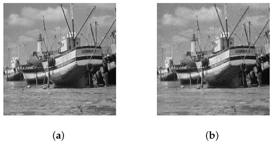 Original Boat image and its approximated low-rank image with rank 50. (a) Original Boat image. (b) Low-rank Boat image with rank 50.