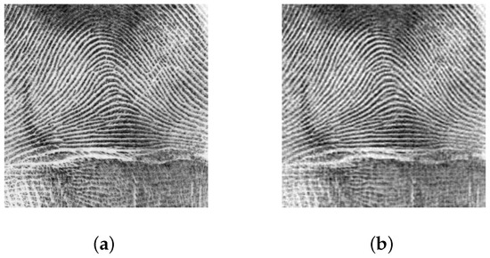 Original Fingerprint image and its approximated low-rank image with rank 50. (a) Original Fingerprint image. (b) Low-rank Fingerprint image with rank 50.