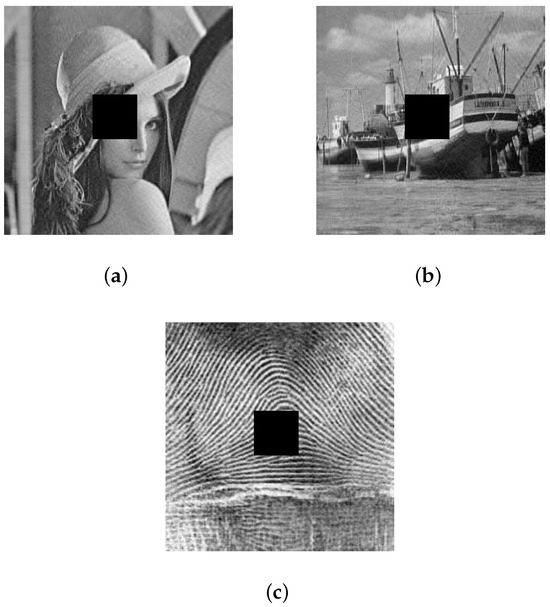 Low-rank images with 3.81% pixels missing. (a) 3.81% pixels missing Lena image. (b) 3.81% pixels missing Boat image. (c) 3.81% pixels missing Fingerprint image.
