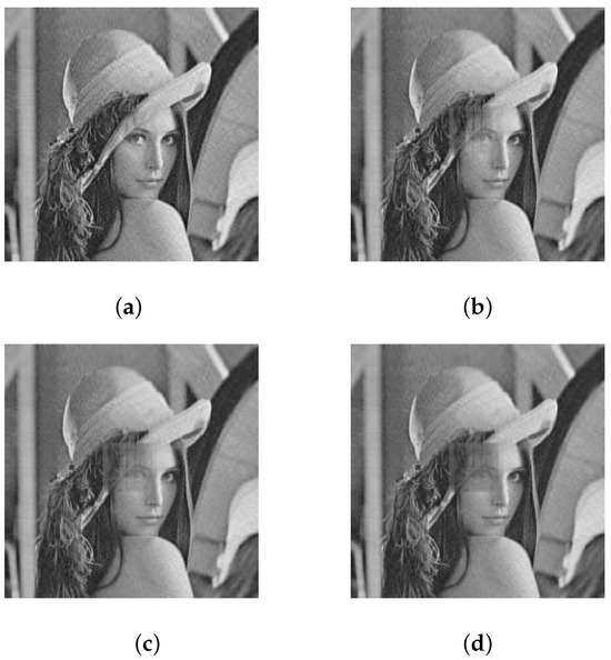 Comparisons of algorithms for recovering the low-rank Lena image with 3.81% pixels missing. (a) AIMDT algorithm, . (b) AIMDT algorithm, . (c) AIMDT algorithm, . (d) SVT algorithm.