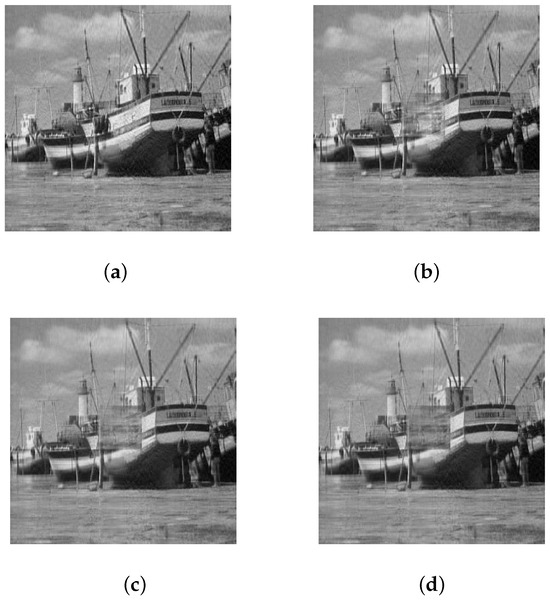 Comparisons of algorithms for recovering the low-rank Boat image with 3.81% pixels missing. (a) AIMDT algorithm, . (b) AIMDT algorithm, . (c) AIMDT algorithm, . (d) SVT algorithm.