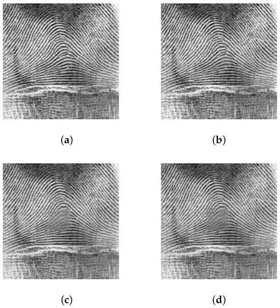Comparisons of algorithms for recovering the low-rank Fingerprint image with 3.81% pixels missing. (a) AIMDT algorithm, . (b) AIMDT algorithm, . (c) AIMDT algorithm, . (d) SVT algorithm.
