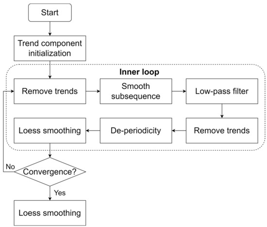 Figure 2) includes two parts: an outer loop and an inner loop. The Loess algorithm is used multiple times in the inner loop to smooth the trend and periodic components. The outer loop calculates robust weights based on the results of the inner loop to reduce the impact of noise on the next inner loop. Overall, the performance of the inner loop in the STL algorithm directly affects the generic performance in various scenarios and data features. The detailed procedure of the inner loop for STL is given as follows. Initialize the value in